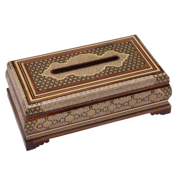 جعبه دستمال کاغذی خاتم کاری هنرلوکس مدل شبنم tpm یک محصول شناسنامه دار ایرانی با ظرافت که توسط هنرمندان و استادکاران خاتم کار خوشذوق و سلیقهی اصفهانی طراحی و ساخته شده است.طول این محصول ۲۷ سانتیمتر ، عرض ۱۶ سانتیمتر و ارتفاع آن ۱۰ سانتیمتر می باشد و وزنی برابر ۸۴۰ گرم دارد. جنس این جا دستمال کاغذی اعلا از چوب درخت راش و با نوع خاتم کاری اعلا از جنس استخوان شتر و سیم های برنجی و مس است. این جعبه کلینکس خاتم کاری درب لولایی دارد که می توان براحتی جعبه دستمال کاغذی را درون آن قرار داد. تمام مراحل طراحی و ساخت این محصول مانند دیگر محصولات خاتم کاری هنرلوکس توسط دست ساخته شده است و دارای شناسنامه هنری و امضای هنرلوکس می باشد. این محصول خاتم کاری شده به دلیل داشتن پوشش محافظ ( پلی استر اعلا) به هیچ عنوان سیاه نمی شود.این اثر اصیل ایرانی، نه تنها میز پذیرایی خانهتان را زیبایی میبخشد، بلکه با فضاهای مجزایی که دارد به سرعت به عنوان یک محصول کاربردی جای خود را در فضای خانهتان پیدا میکند. این محصول با داشتن خصوصیاتی از قبیل صاف بودن سطح کار و خالی نبودن هیچ جای خاتم، یکنواخت بودن رنگ و مصالح به کار رفته در ساخت خاتم، عدم تغییر در رنگ و شکل، ترمیمکاریها و بتونهکاریها در سطح کار مشخص نمی باشد، قرینه بودن تمامی گلها و اشکال در سطح کار و زوایا و اضلاع با اندازه ای بسیار ریز، دقیق و مهندسی بودن اساس و ساختمان طرح که تمامی ابعاد با هم همسان، قرینه و یک اندازه می باشد کیفیت و ارزش هنری و مادی بالای محصولات را نشان می دهد.لازم است توجه شود که کلیهٔ محصولات خاتمکاری شده بایستی دور از حرارت، رطوبت و نور مستقیم خورشید نگهداری و از تمیز کردن آنها با پارچهٔ مرطوب و از به کار بردن هر گونه جلاسنج بر روی سطوح خاتم اجتناب شود.