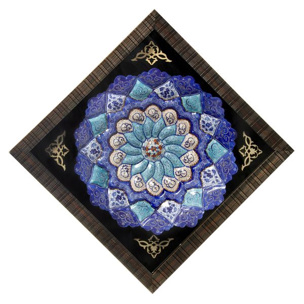 این بشقاب از جنس مس به قطر۳۰سانتیمتربه دست هنرمندان اصفهانی به زیبایی مینا کاری شده ودر یک قاب PVC جای گذاری گردیده است که دارای حلقه ای در پشت قاب برای نصب روی دیوار و دارای یک شیشه در قسمت جلوی قاب برای محافظت از اثرنیز هست