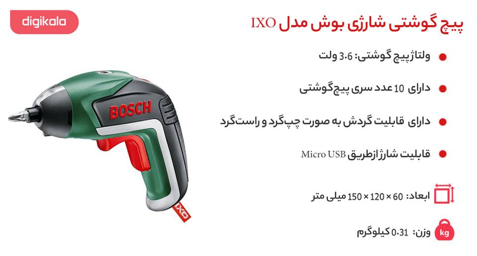 آنهایی که بیشتر سروکارشان با پیچ و پیچگوشتی است، میدانند که مثلا بستن ۱۰۰ پیچ حتی با طول متوسط، چهکار زمانبر، طاقتفرسا و خستهکنندهای است. شرکت «بوش» (Bosch) که بدون تردید از برندهای شناختهشده در تولید لوازم برقی و الکتریکی است، در صنعت هم این جایگاه را حفظ کرده و غیراز ایجاد انگیزه برای خرید لوازم خانگی تولیدیاش، مشتریان خاصی را برای تولیدات خود در حوزهی ابزار جذب کرده است. این شرکت با ارائهی پیچ گوشتی شارژی مدل IXO ابزاری قدرتمند با کیفیت مناسب در اختیار مشتریانش قرار میدهد. این مدل با وزن بسیار نسبتا کم (۳۱۰ گرم) و سرعت گردش آزاد ۲۱۵ دور در دقیقه، یک پیچگوشتی شارژی سبک و نیرومند به شمار میآید. از ویژگیهای جالبتوجه این دستگاه، باتری لیتیوم-یونی آن است. قیمت پایین و قابلیت توان بالای این باتریها، آنها را به بهترین گزینه برای وسایل پرتابل دارای موتور مانند ابزارهای قدرتی تبدیل کرده است. امروزه حضور ابزارهای برقی باعث تسهیل امور شده و با استفاده از این ابزارها، میتوان سرعتعمل در کارها را به میزان قابلتوجهی بالا برد.
