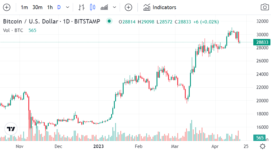قیمت بیت کوین در روز چهارشنبه، با شروع به تحکیم بازارها پس از افزایش قیمت اخیر، کاهش یافت. پس از ۳۰,۴۷۰.۳۰ دلار در روز سه شنبه، بیتکوین در اوایل روز به ۲۹,۱۰۲.۱۷ دلار سقوط کرد و بیت کوین را به پایین ترین حد خود از ۱۰ آوریل رساند، یعنی زمانی که قیمت آن به کمتر از ۲۹۰۰۰ دلار رسید.