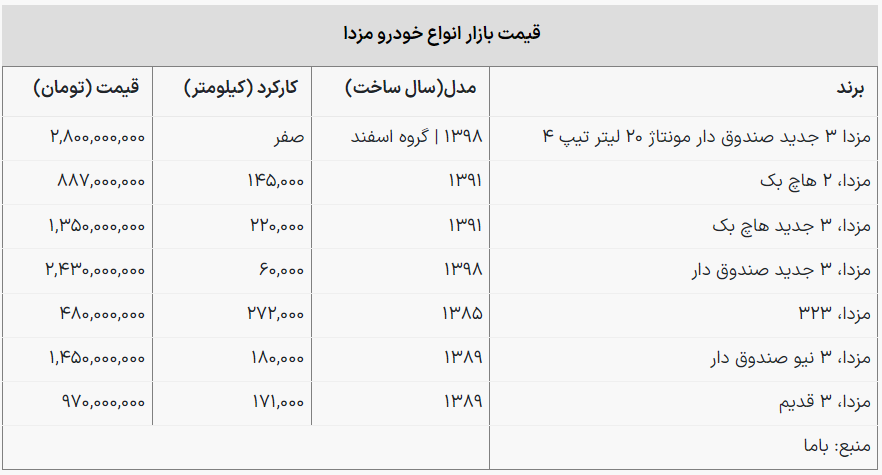 در این گزارش به قیمت روز انواع مزدا در بازار آزاد می پردازیم.