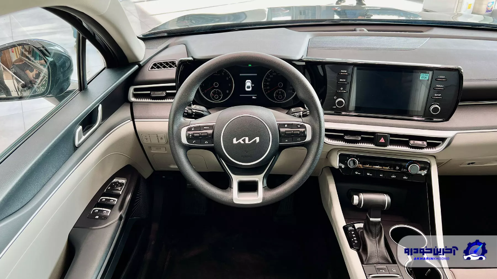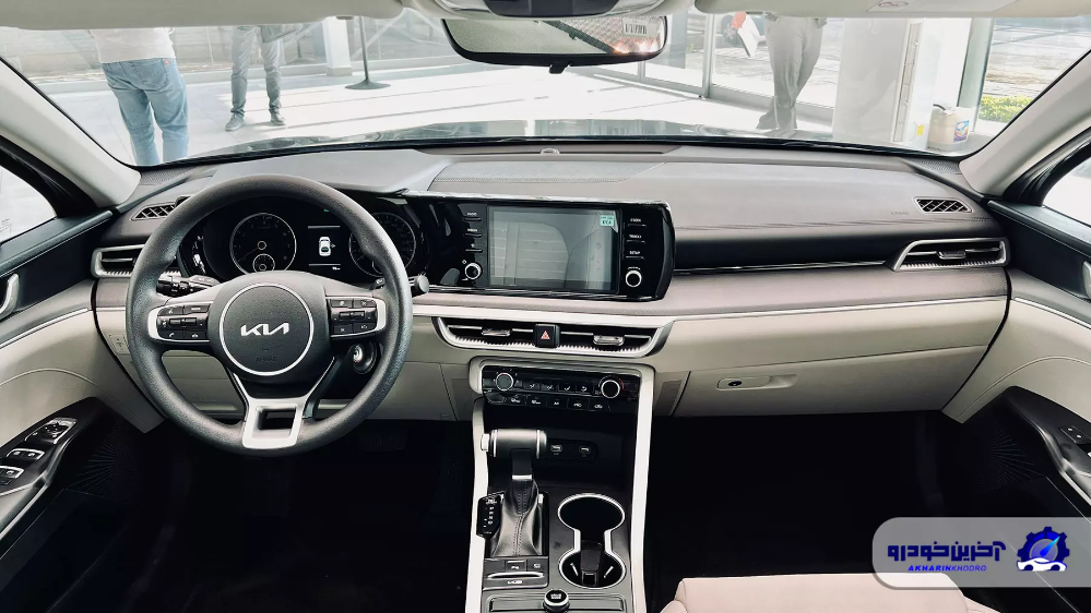از آنجا که نمونه وارداتی فول آپشن نیست پس در این خودرو خبری از کلاستر دیجیتال یا تهویه اتوماتیک هم نیست. البته کلیت طراحی کابین جذاب است و ارگونومی راضی کننده را در خودرو می بینیم. تریم داخلی نمونه معرفی شده دو رنگ مشکی-کرم است و روکش پارچه ای را روی صندلی ها می بینیم. همانطور که گفته شد K5 وارداتی کوشا خودرو نمونه فول نیست و در آن امکاناتی نظیر چراغ های LED، سنسور نور، دو کیسه هوای راننده و سرنشین، سامانه کنترل پایداری و کشش، سیستم کنترل حرکت در سربالایی، سیستم پایش میزان باد تایرها (TPMS)، دوربین و سنسور عقب، کروز کنترل، تهویه دستی و نمایشگر ۸ اینچی اندروید با قابلیت اتصال اپل کارپلی و اندروید اتو دیده می شود.