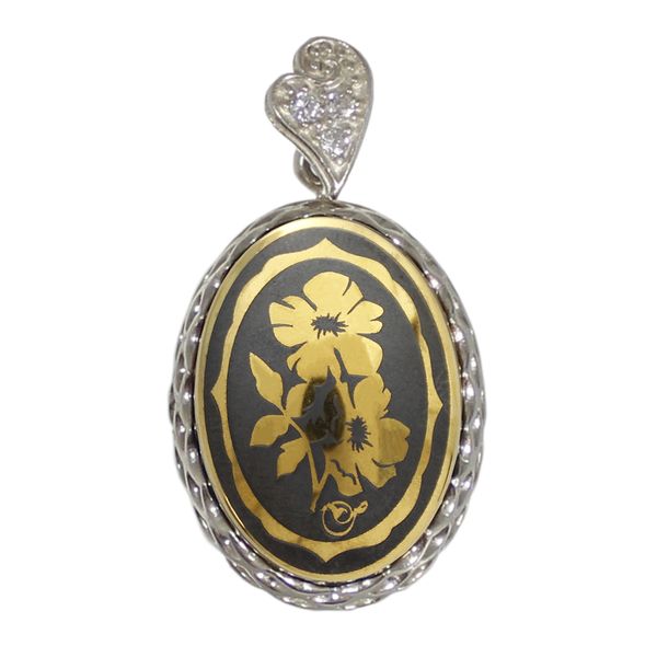نگین این آویز سنگ حدید است .با حکاکی نماد گل نسترن, اردبیهشت ماه که که به رنگ مشکی و طلایی می باشد