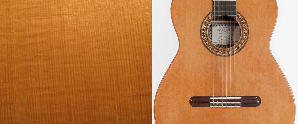 این چوب بهطور سنتی در سازهای کلاسیک استفاده میشود اما بهطور فزایندهای به محبوبیت این چوب در گیتارهای دیگر ازجمله گیتارهای آکوستیک اضافهشده است. چوب سدر، رنگی تیرهتر نسبت به چوب صنوبر دارد. چوب سدر در محدوده طیف رنگی شکلاتی تا دارچینی جای میگیرد و گیتار ساختهشده از این چوب معمولاً تیرهتر از چوبهای دیگر است. این چوب تراکم کمتری نسبت به چوب صنوبر دارد تولید صدایی گرمتر و بم با تولید هارمونیکهای پیچیدهتر از ویژگیهای این چوب است. سختی کمتر در این چوب به وزن کمتر آن انجامیده است. سدر فاقد شفافیت در حجم بالاست اما دارای غنای موسیقایی فوقالعاده و محبوب کلاسیک نوازها است.