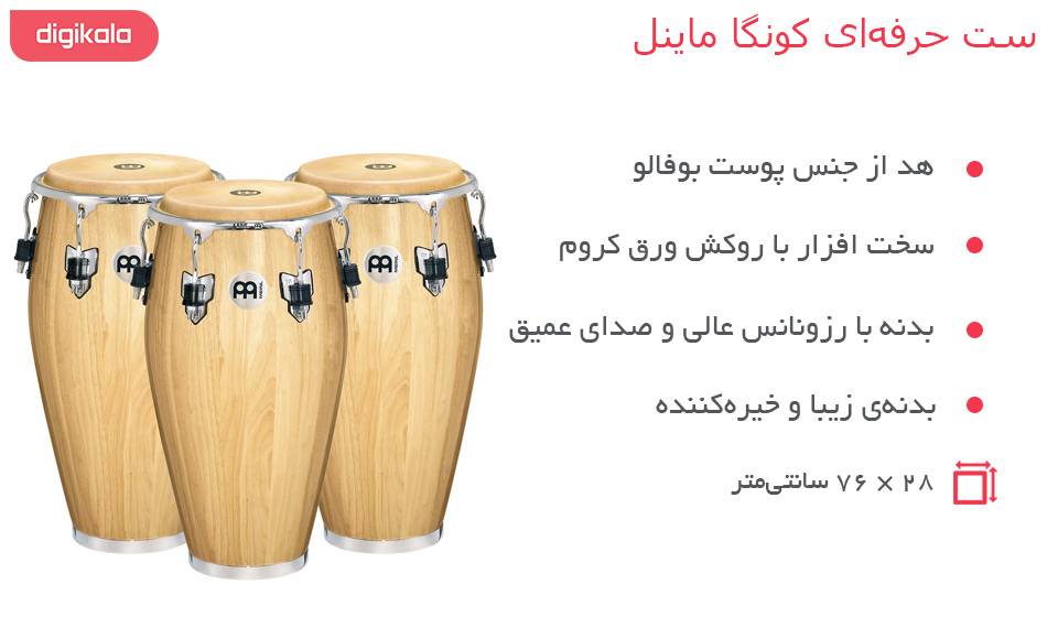ست کونگا حرفهای «ماینل» (Meinl) سازی است که در کنار ظاهر زیبا و جذاب خود صدای منحصربهفرد و بسیار باکیفیتی را به نوازنده و شنونده عرضه میکند. این سری از کونگاهای ماینل که در سه اندازهی یازده اینچ و یازده و سهچهارم اینچ و دوازده و یکدوم اینچ ساخته میشوند در سه رنگ طبیعی، قهوهای و قرمز به مصرفکننده عرضه میگردند. مدلی که در این صفحه با آن مواجه هستیم از نوع یازده اینچی و با رنگ طبیعی به شمار میرود. کونگاهای حرفهای ماینل موردعلاقه و استفادهی نوازندگان حرفهای کونگا در تمام جهان هستند و بسیاری از نوازندگان درجهیک این ساز استفاده از این مدل را ترجیح دادهاند.