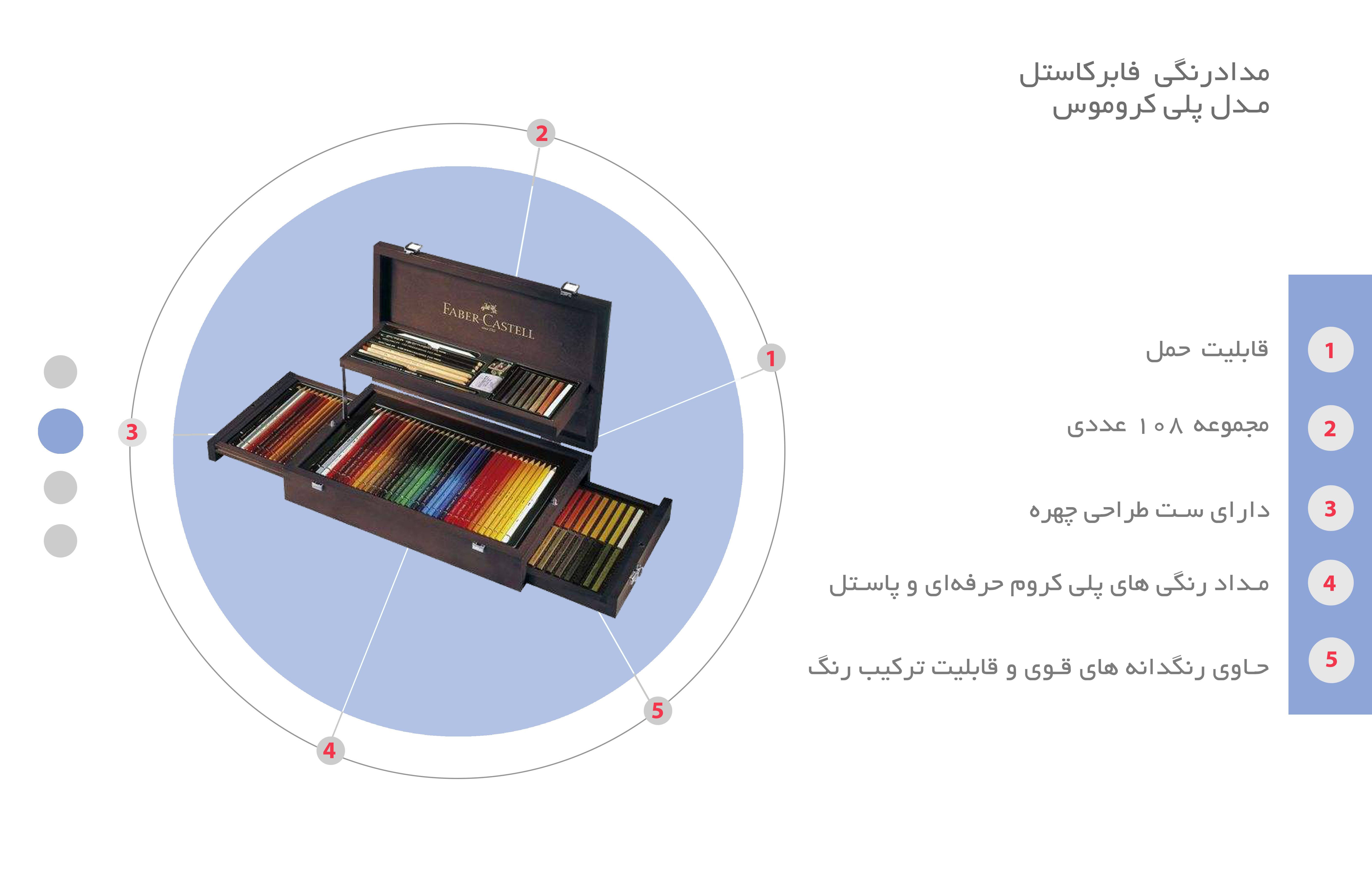 این ست دارای مداد های طراحی فابر کاستل حرفه ای، مداد رنگی های پلی کروم حرفه ای و پاستل می باشد. -