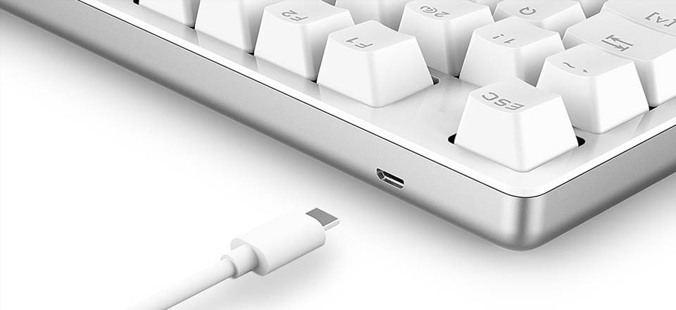 کیبورد Yuemi همراهی بسیار خوب در فضای تاریک است. چراکه میتوانید نورهای پسزمینه آن را در ۶ سطح تنظیم کنید. کلیدهای Win، Scroll، Caps Lock با داشتن نورهای نارنجی و سفید از بقیه کلیدهای این کیبورد متمایز هستند. البته سطح فوقانی این کیبورد تا حدی شفاف است و نور را بازتاب میدهد که ممکن است برای برخی چندان خوشایند نباشد. نکته دیگری که باید به آن اشاره کنیم این است که در این کیبورد خبری از کلیدهای عددی (num lock) نیست. این امر شاید خبر خوبی برای حسابدارها نباشد اما برای کسانی که کیبوردی حمل شدنی و جمعوجور میخواهند، خبر خوبی است. اتصال این صفحهکلید از طریق کابل و درگاه microUSB انجام میشود که خبر خوبی است؛ چراکه میتوانید با جدا کردن کابل، کیبورد را راحتتر در کیف خود جای دهید و اگر کابل کیبورد شما دچار مشکل شد، بهراحتی میتوانید آن را عوض کنید.
