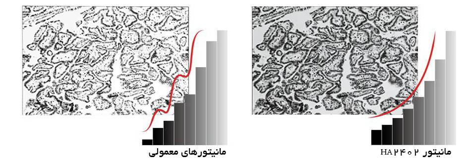 برای رفع نیازهای مربوط به تحلیل تصاویر پزشکی در کلینیکهای تخصصی شرکت ایسوس مانیتور HA2402 را به ۵ حالت (Mode) پیشفرض تجهیز کرده تا بتوان با دقت بالا تصاویر را تحلیل کرد. این حالتها شامل Dicom، حالت استاندارد، Blue-Base، Clear-Base و Light Box است. درحالت لایت باکس میتوان از مانیتور برای نمایش عکسهای رادیولوژی چاپ شده استفاده کرد. وجود این پنج Mode دقت را در امور پزشکی تا حد زیادی افزایش میدهد. علاوهبر این وجود پنل IPS در این محصول باعث شده که بتوان تصاویر را کیفیت بالا مشاهده کرد. این موضوع هم در تحلیل دقیقتر برای پزشکان بسیار با اهمیت است.