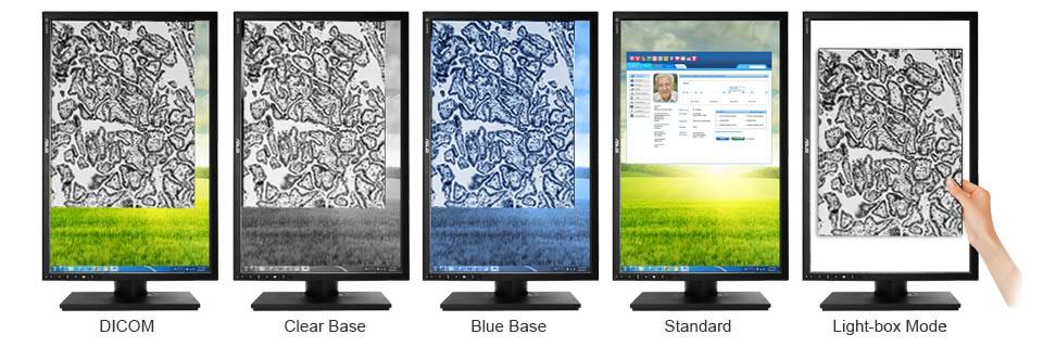 وضعیتهای پزشکی از پیش تعیین شده: DICOM Mode / Clear Base Mode / Blue Base Mode / Standard Mode / Light-box Mode
