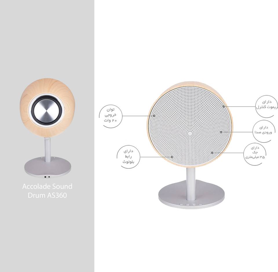 اسپیکر « Drum AS360» محصولی از شرکت Accolade Sound است که از طراحی بسیار جذابی بهره میبرد. این اسپیکر به دو صورت باسیم و بیسیم به تلفنهمراه یا پخشکننده صوتی شما متصل میشود و صدایی قدرتمند را برای شما به ارمغان میآورد. اتصال بیسیم در این محصول از طریق فناوری بلوتوث انجام میپذیرد. اگر تلفنهمراه یا پخشکننده صوتی شما از بلوتوث پشتیبانی نمیکند جای هیچگونه نگرانی نیست چرا که AS360 به راحتی میتواند از طریق جک ۳.۵ میلیمتری صدا (AUX) به پخشکننده صوتیتان متصل شود. از ویژگیهای بسیار خوب این محصول وجود یک درگاه صدا برای اتصال یک اسپیکر AS360 دیگر به این محصول است. جنس پایهی این محصول از فلز با کیفیت بوده که حس خوبی را به کاربر منتقل میکند. روی پایهی این محصول چهار کلید مشاهده میشود که میتوان به کمک آنها اقدام به کم یا زیاد کردن صدا، MUTE (قطع کردن صدا) و خاموش یا روشن کردن اسپیکر کرد. برای آنکه وضعیت اتصال را از بلوتوث به اتصال از طریق کابل تغییر داد کافی است که یک بار روی کلید خاموش کردن کلیک کرد تا رنگ نشانگر LED تعبیه شده در کنار کلیدها تغییر کند. در جعبهی این محصول یک ریموت کنترل برای کنترل از راه دور اسپیکر مشاهده میشود. فرکانس پاسخگویی این محصول ۸۰ هرتز تا ۱۸ کیلوهرتز است. اسپیکر AS360 انرژی خود را از طریق برق شهری تامین میکند و در گروه اسپیکرهای دسکتاپی قرار میگیرد.