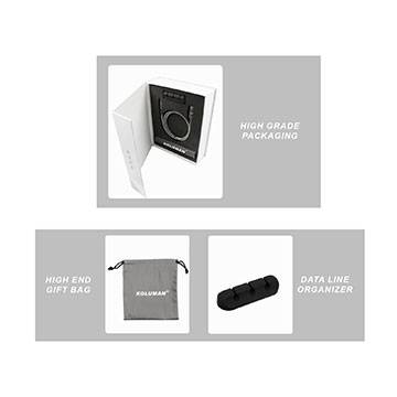 درون بسته بندی این کابل علاوه بر کابل شارژ یک عدد نظم دهنده کابل سه تایی و یک عدد کیف برای نگهداری کابل قرار دارد.