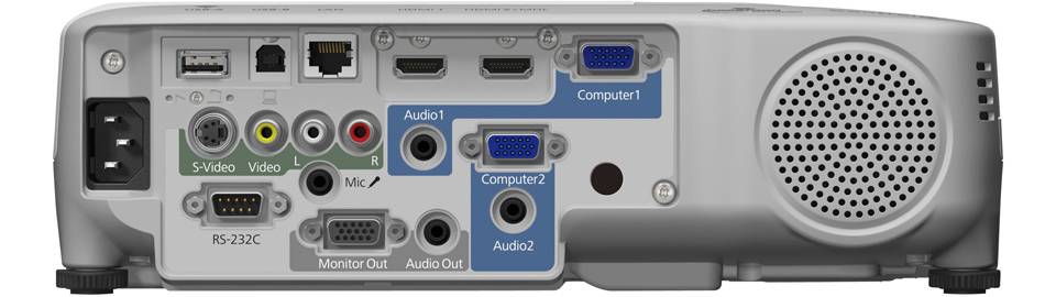 پنل درگاههای ورودی پروژکتور همانند مدلهای دیگر در قسمت پشتی بدنه تعبیه شده است و دو ورودی کامپیوتر، کامپوننت، و دو درگاه HDMI (یکی سازگار با MHL) در میان آنها دیده میشود. همچنین درگاههای USB Type B برای پخش مستقیم از طریق USB، درگاههای کامپوزیت و S-Video و در پایان درگاه USB Type A برای پخش اطلاعات از فلش مموری و یا اتصال دانگل WiFi از دیگر درگاههای این دستگاه هستند. میتوان گفت شرکت اپسون در این محصول مجموعهی کامل و متنوعی را از اتصالات فراهم ساخته است.