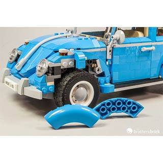حال اگر این فولکس زیبا را از پهلو بررسی کنیم، یک رینگ طوسی رنگ خواهیم دید که در کنار گلگیرهای بزرگ و نیمدایرهاش و آینههای بغل طوسی رنگش و دستگیره برجستهی در زیبایی منحصربهفردی پیدا کرده است. گفتنی است گلگیر این ماشین از تکهای اختصاصی ساخته شده که تا قبل از طراحی این ماشین چنین تکهای در قطعات لگو موجود نبوده است.