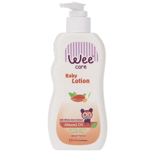 پوست نوزادان بسیار نازک و حساس است و رطوبت نیاز دارد. برای مراقبت از پوست نوزاد و مرطوب کردن آن، استفاده از لوسیون بسیار موثر خواهد بود. لوسیون کودک «وی کر» (Wee care) حاوی روغن بادام و عصاره جوانه گندم در حجم ۲۰۰ میلی لیتر، یکی از انواع خوب این نوع محصول است. روغن بادام دارای خواصی است که در نرم کردن و ترمیم پوست اثر فوقالعادهای دارد. این روغن دارای زینک، منیزیم، آهن و ویتامینهای E, B6 و B2 است که برای سلامت پوست ضروریاند. همچنین جوانه گندم از غنیترین منابع ویتامینهایی چون A, E , D و K است و از التهاب و خشکی پوست جلوگیری میکند. چنین ترکیبی از این دو روغن حیاتی، کمکی مفید برای طراوت بخشی و مراقبت از پوست نوزاد خواهد بود. لوسیونهای بدن در انواع مختلف به صورت کرم یا شیری موجوداند. لوسیونها دارای ترکیباتی هستند که قادر به محافظت از پوست هستند. لوسیون رطوبت بدن را حفظ کرده و آنرا نرم و لطیف میسازد. در ترکیبات آن از انواع روغنها، وازلین و عصارههای مفید استفاده میشود. این نوع ترکیب بخصوص برای کودکان با پوست بسیار خشک، بسیار کمک رسان و مفید است. در لوسونها از الکل، عطر و مواد نگهدارنده اثری نیست. لوسیونها معمولا برای ماساژ دادن بدن کودک استفاده میشوند و این کار به جذب بهتر مواد آن به پوست نیز کمک میکند.