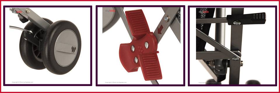 این کالسکهی اسپرت باوجود کمربند ایمنی ۵ نقطهایاش میتواند کودک را از پنج نقطه مهار کند. کمربندها علاوه برداشتن پوشش نرم که روی بدن قرار میگیرد باید از طرف هر دو شانه ، دو طرف کمر و بین پای کودک عبور و آنها مهار کند. Trimph این قابلیت را دارد. علاوه بر کمربند ایمنی پنج نقطهای دارای ترمزهای قفلدار بر روی چرخهای عقب است که بهصورت پایی میتوان از آن بهراحتی استفاده کرد. چرخهای جلوی آن بهصورت چرخشی هستند و قابلیت حرکت به اطراف را دارند. چرخهای این کالسکه بسیار سبک و پرشده از توپکهای هوا هستند.