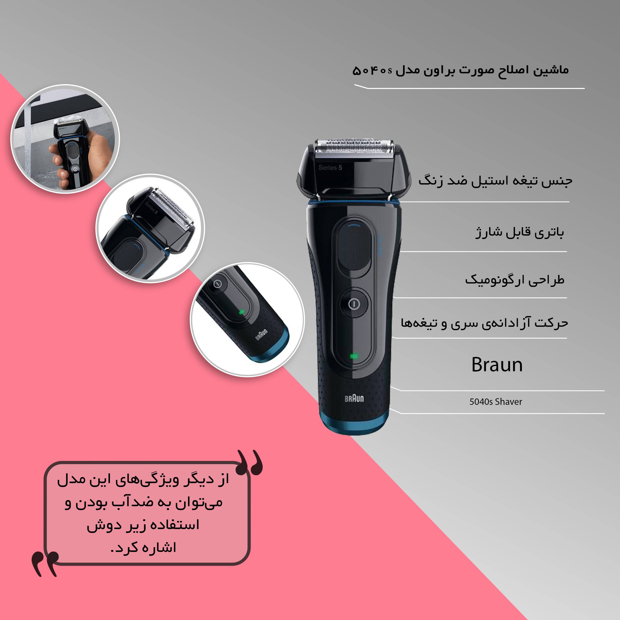 شاید زمانی حتی رویای کار کردن یک وسیلهی برقی در کنار رطوبت خندهدار و البته خطرناک بود. آب هادی جریان الکتریسیته و تقریبا بزرگترین دشمن وسایل برقی است. شاید مهمترین نقطه قوت و برگ برندهای که براون در هنگام ارائهی این ماشین اصلاح رو کرده کاملا ضد آب بودن آن است. کسب استاندارد IPX7 به این معنی است که این ماشین اصلاح می تواند بدون هیچ مشکلی تا عمق ۵ متری در آب غوطهور شود. و البته کاربر میتواند برای تمیز کردن آن را مستقیما زیر شیر آب گرفته و آن را دقیق و کامل تمیز کند. عبارت Wet & Dry که براون به اعضای سری۵ ریشتراشهای خود اطلاق کرده، به این مفهوم است که میتوان هم در حالت معمول و هم در مجاورت رطوبت به اصلاح صورت پرداخت. به عبارت دیگر کاربر میتواند پوست صورت خود را با استفاده از ژلها یا فومهای اصلاح کاملا مرطوب و نرم کرده و سپس با استفاده از این ماشین، اصلاحی نرم، کامل و بی نقص را تجربه کند. تجربهای که تا پیش از این تنها با استفاده از تیغ ممکن بود. از طرفی قابلیت شستشوی سَری این ماشین اصلاح با جریان مستقیم آب، آن را سریعتر و کاملتر تمیز میکند. برای خشک کردن 5040s بعد از شستشو کافیست آن را چند بار تکان داده و در محل خود قرار دهید.