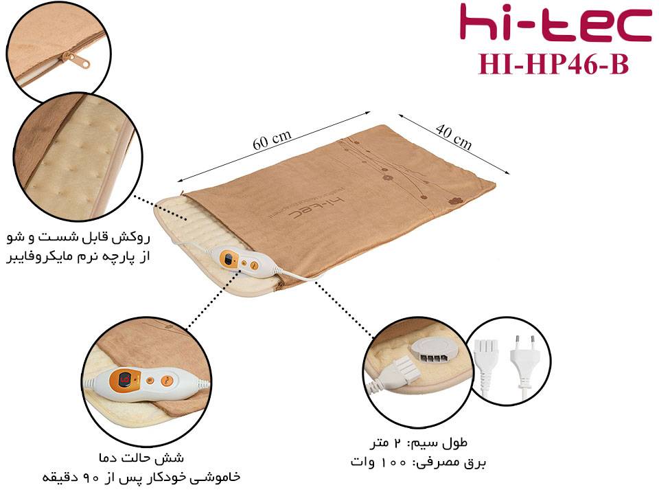 تشکچه برقی «هایتک» (Hi-Tec) مدل «HI-HP46-B» وسیلهای گرمایشی با اندازهای مناسب است که گرمایی ملایم تولید میکند. گرمای این تشکچه به اندازهای است که بتوانید مدت طولانی از آن استفاده کنید و مجبور به خاموش کردن آن نباشید. البته برای ایمنی بیشتر، خود تشکچه بعد از ۱.۵ ساعت به شکل خودکار خاموش میشود. استفاده از این تشکچه زیر پتو باعث میشود گرمای آن حفظ شود و در فصول سرد سال حس لذت بخشی را به وجود میآورد. روکش HI-HP46-B پارچهی نرمی است که در تماس با پوست حساسیتی ایجاد نمیکند و میتوان چند وقت یکبار آن را جدا کرده و شست. مصرف برق تشکچه در حد یک لامپ حبابی ۱۰۰ وات است. طول سیم برق نیز مناسب است و میتوان با فاصله گرفتن از پریز از تشکچه استفاده کرد. کنترلر هم با مقداری فاصله از خود تشکچه برقی قرار گرفته تا دست و پاگیر نباشد.