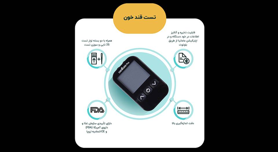 قند خون مادر باردار یکی از شاخصهای اثرگذار بر سلامت مادر و جنین است. در صورت عدم کنترل قند خون مادر احتمال ابتلای مادر به دیابت بارداری وجود دارد و دیابت بارداری عوارضی برای مادر و نیز جنین به دنبال خواهد داشت؛ بهاینترتیب مشاهده تغییرات قند خون در دوران بارداری از اهمیت بالایی برخوردار است. در مجموعه مراقبت بارداری مامنیا یک دستگاه تست قند خون هم قرار گرفته است. این دستگاه دارای یک LCD بزرگ است و اندازه اعداد و اطلاعات نمایش داده شده در آن بهآسانی قابلمشاهده است. حداقل خون مورد نیاز این دستگاه ۰.۵ میکرو لیتر است و زمان پاسخگویی به تست حداکثر تا ۵ ثانیه انجام میشود. انرژی این دستگاه بهوسیله یک عدد باتری سکهای CR2023 تأمین میشود که تا حدود ۱۰۰۰ تست، عمر کارکرد دارد.