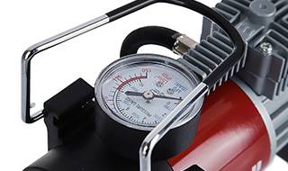معمولا فشار باد لاستیکهای خودرو مقداری بین ۳۰ تا ۳۵ پی اس آی است. با کمک این کمپرسور به راحتی میتوانید فشار باد تایرها را به این مقدار برسانید. حداکثر فشار هوای تولیدی این محصول ۱۴۵ پی اس آی است. برای باد کردن بهتر و دقیقتر تایرها میتوانید از فشارسنج کمپرسور استفاده کنید. این فشارسنج دامنهی فشاری بین ۰ تا ۱۰ بار را اندازهگیری میکند.