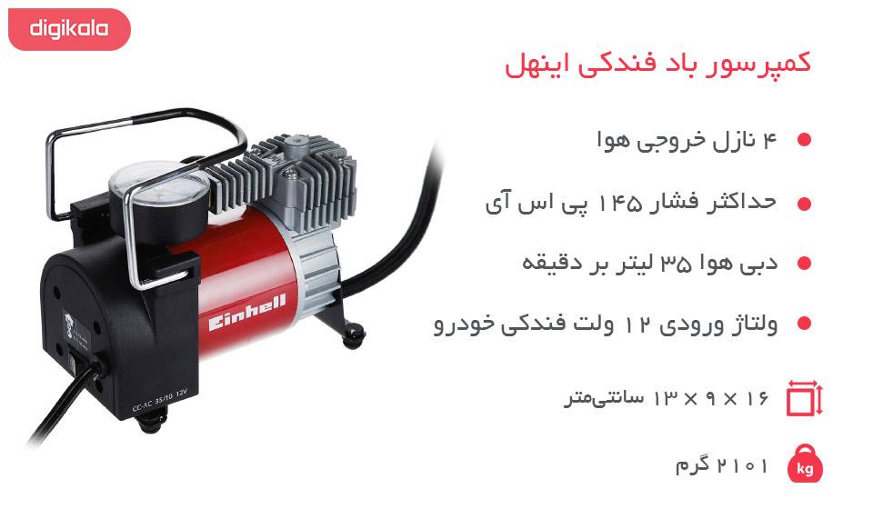 شرکت «اینهل» (Einhell)از بزرگترین تولیدکنندگان ابزار صنعتی بوده که کمپرسور باد فندکی مدل «CC-AC 35/10 12V» را به بازار عرضه کرده است. این محصول به شما کمک میکند تا بتوانید از فشار هوای ۱۴۵PSI در تمامی نقاط خودروی خود استفاده کنید؛ این امر بهعلت وجود شلنگ ۱۵۰سانتیمتری باد و کابل برق ۲.۹متری است. با استفاده از باد حاصل از این کمپرسور میتوانید جهت نظافت خودرو و همچنین بادکردن انواع توپ، تایر موتورسیکلت، تایر دوچرخه و تایر خودرو از چهار نازل ارائهشده بههمراه محصول استفاده کنید. فشارسنج موجود روی دستگاه نیز در حین کار، فشار هوای خروجی از کمپرسور را به شما نشان میدهد که از ۰ تا ۱۰ بار درجهبندی شده است. CC-AC 35/10 12V دارای فناوری پیشرفته بوده و کار با آن بسیار ساده است. این محصول دارای یک خروجی هوا با دبی ۳۵ لیتر بر دقیقه بوده و همچنین دارای دکمهی روشن و خاموش است که باعث میشود به محض اتصال به فندکی خودرو، دستگاه بیدرنگ روشن نشود و هر زمان که کاربر بخواهد، میتواند آن را روشن و خاموش کند. این محصول انتخابی مناسب جهت استفاده از فشار هوای مناسب در نقاط مختلف خودروی شماست.