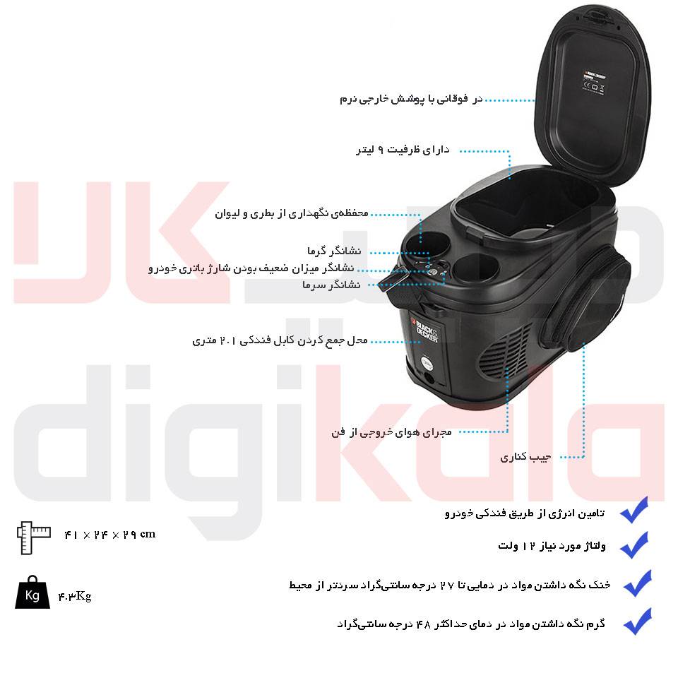 محصول موردنظر، نوعی فلاسک غذای خودروست که شرکت معروف «بلک اند دکر» (Black & Decker) آن را طراحی و تولید کرده است. این مدل با نام «BDV212F» شناخته میشود. این فلاسک، بسیار کاربردی و کارآمد است و به کمک آن میتوانید بدون نگرانی، محصولات غذاییتان را در دمای مناسب نگهداری کنید. از ویژگیهای جالب این دستگاه، قابلیت خنکسازی یا گرمنگهداشتن موادغذایی است و میتوانید با توجه به نیاز خود فلاسک را روی حالت موردنظر قرار دهید. حداکثر دمای داخلی این فلاسک، ۴۸ درجهی سانتیگراد بوده و حداقل دمای خنکسازی آن ۲۷ درجهی سانتیگراد پایینتر از دمای محیط است. این محصول با ظرفیت ۹ لیتر از طراحی مناسب و زیبایی بهره میبرد. این فلاسک به کمک بندی که دارد، بهراحتی روی دوش حمل میشود. یکی از مزیتهای بارز این دستگاه، روش تامین برق موردنیاز آن است. ولتاژ مناسب برای این فلاسک ۱۲ ولت است و برق موردنیاز خود را از طریق فندکی خودرو تامین میکند. این ویژگی باعث میشود برای استفاده از این محصول محدودیتی نداشته باشید و بتوانید بهراحتی در هر خودرویی از آن استفاده کنید. این فلاسک قطعکن اتوماتیک دارد و با رسیدن دمای محتویات به مقدار موردنظر، جریان برق را قطع میکند؛ این مزیت در کنار عایقبندی مناسب، راندمانی مطلوب به فلاسک بخشیده است. با کمک این فلاسک میتوانید موادغذایی نیازمند به سرما را خنک نگه داشته و موادغذایی نیازمند گرما را در شرایط مطلوبی قرار دهید. این محصول برای مسافرتهایی که با خودروهای شخصی انجام میگیرد، گزینهای بسیار مناسب است. شرکت بلک اند دکر سالهاست که در زمینهی ابزارآلات برقی و دستی فعالیت میکند. محصولات این شرکت کیفیت بالایی دارند و با توجه به کیفیتشان، با قیمتی مناسب عرضه میشوند.
