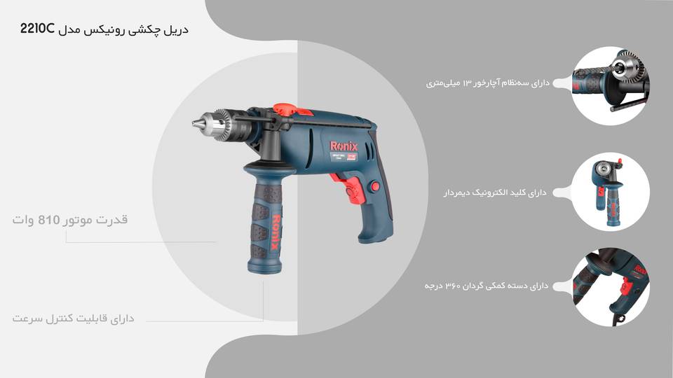 دریل چکشی فوق یکی از محصولات تولیدی شرکت «رونیکس» (Ronix) است که تحت عنوان مدل «2210C» به بازار عرضه میشود. این محصول به دلیل چکشی بودن برای سوراخکاری گچ و سیمان نیز مناسب است.
