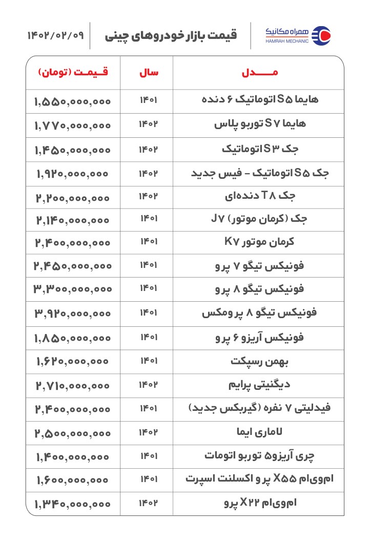 در ادامه جدول قیمت روز خودروهای چینی را مشاهده میکنید: